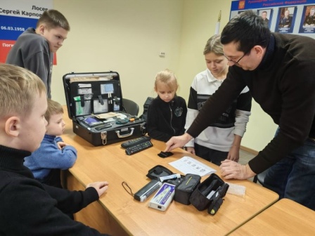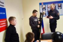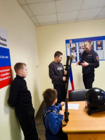 Сотрудник группы по работе с личным составом лейтенант полиции Даниил Скобин показал детям образцы специальных и индивидуальных защитных средств, которые используют сотрудники полиции при несении службы. Он рассказал об особенностях службы в полиции, обучении в ведомственных вузах МВД России, поступлении на службу.