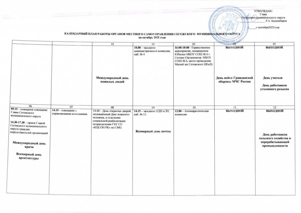 Календарный план работы органов местного самоуправления Сегежского муниципального округа на октябрь 2025 года