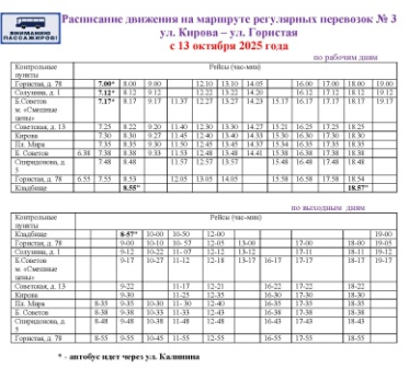 С 17 декабря пассажирские перевозки автобусного рейса по маршруту № 3 ул.Кирова - ул.Гористая будут осуществляться автобусом согласно расписанию.