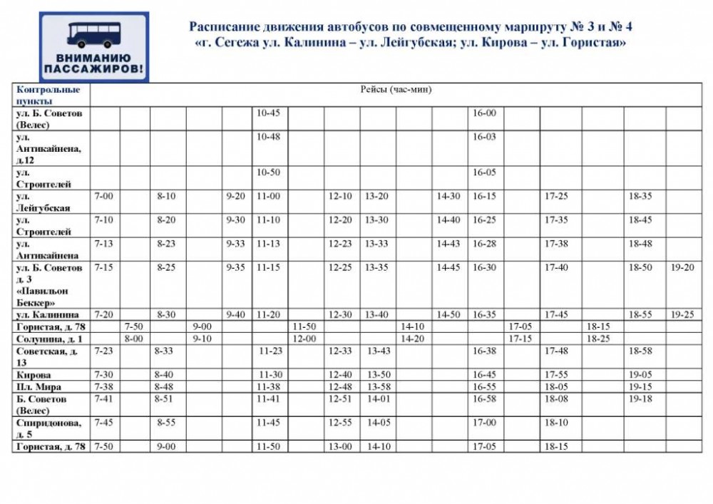 В связи с недостаточной укомплектованностью водительскими кадрами, пассажирские перевозки по автобусным маршрутам № 3 и № 4 будут осуществляться по совмещенному расписанию. ВНИМАНИЕ! Подвоз обучающихся, которые пользуются регулярными городскими автобусными маршрутами для проезда на общественном транспорте по городу Сегежа, предоставляется бесплатно в рабочие дни. Рекомендуем следить за актуальной информацией в официальном паблике vk.com/segezhsky. О дальнейшем графике движения автобусов будет сообщено дополнительно. Приносим извинения за временные неудобства и просим с пониманием отнестись к вынужденным изменениям.
