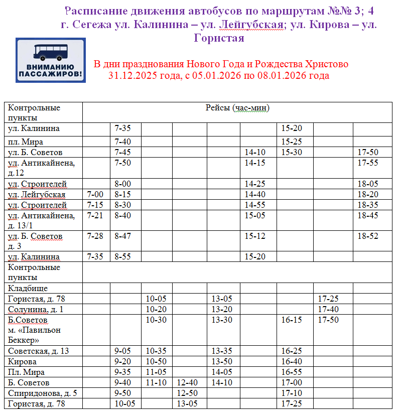 ВНИМАНИЕ! С 01 по 04 января 2026 года автобусные рейсы осуществляться не будут (выходные дни)!Рекомендуем следить за актуальной информацией в официальном паблике vk.com/segezhsky. О дальнейшем графике движения автобусов будет сообщено дополнительно.Приносим извинения за временные неудобства и просим с пониманием отнестись к вынужденным изменениям.