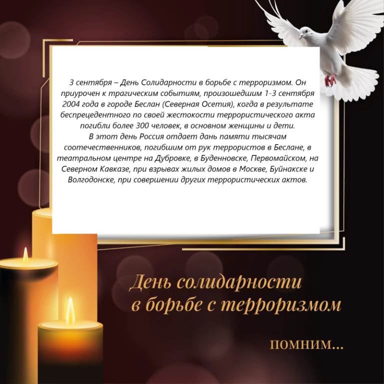День солидарности в борьбе с терроризмом символизирует единение государства и общества против такого страшного явления, как терроризм, которое превратилось в одну из опаснейших глобальных проблем современности, серьезную угрозу безопасности всего мирового сообщества. Россия – не исключение.