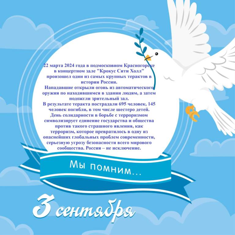 Он приурочен к трагическим событиям, произошедшим 1-3 сентября 2004 года в городе Беслан (Северная Осетия), когда в результате беспрецедентного по своей жестокости террористического акта погибли более 300 человек, в основном женщины и дети. В этот день Россия отдает дань памяти тысячам соотечественников, погибшим от рук террористов в Беслане, в театральном центре на Дубровке, в Буденновске, Первомайском, на Северном Кавказе, при взрывах жилых домов в Москве, Буйнакске и Волгодонске, при совершении других террористических актов. 22 марта 2024 года в подмосковном Красногорске в концертном зале "Крокус Сити Холл" произошел один из самых крупных терактов в истории России. Нападавшие открыли огонь из автоматического оружия по находившимся в здании людям, а затем подожгли зрительный зал. В результате теракта пострадали 695 человек, 145 человек погибли, в том числе шестеро детей.