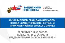 22 декабря в Сегежском муниципальном округе пройдет совместный прием социальных координаторов филиала фонда «Защитники Отечества» и прокурора Сегежского района. Приглашаем участников специальной военной операции и членов их семей.Время приема: с 14:30 до 15:30.