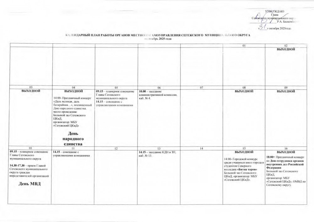Календарный план работы органов местного самоуправления Сегежского муниципального округа на ноябрь 2025 года.